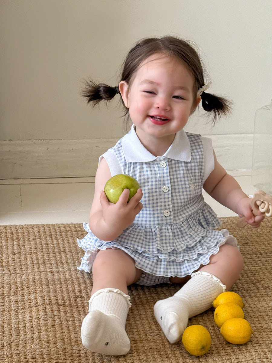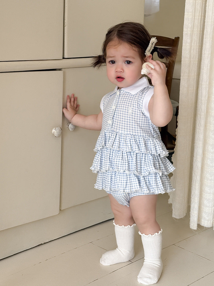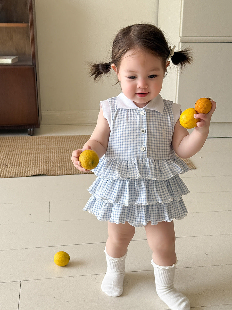 女童夏季薄款宝宝包屁格子连身裙,采用清爽蓝白格纹设计,白色滚边点缀增添精致感。轻薄透气面料适合炎热天气,蛋糕裙摆设计俏皮可爱,展现小女孩的灵动气质。包屁设计确保活动自如,无需担心走光。简约而不失趣味的款式,是夏日出游、日常穿搭的理想选择,让宝宝舒适又时尚。